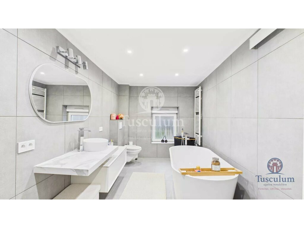 A l’étage, vous découvrirez deux chambres, un vaste dressing et une magnifique salle de bain. Elle est équipée d’une douche à l’italienne, d’une vasque avec son rangement, d’une baignoire ilot et de toilettes.